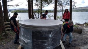 We’ve kept the setting as untouched as possible. No trees were cut down; only a few bushes cleared to make room for our unique forest bathing experience. Stone slabs, sourced locally, form a gentle path into the lake—perfect for alternating between hot tub relaxation and wild swimming . Each stone was floated in by canoe, one by one, respecting the delicate forest ecosystem.